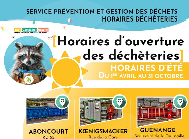 ❕ Retrouvez les horaires d'ouverture de nos déchèteries communautaires situées à Aboncourt, Guénange et Kœnigsmacker