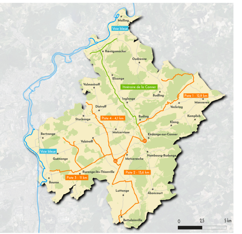 en connectant L’Arc Mosellan aux Communautés de Communes du Bouzonvillois Trois frontières, de Rives de Moselle, du Haut Chemin Pays de Pange et de Cattenom et Environs, à la Communauté d’Agglomération Portes de France Thionville, mais encore à la Voie Bleue V50 reliant la Moselle à la Saône, la piste de la Vallée de la Canner, les linéaires communaux et même les réseaux doux allant jusqu’en Sarre.